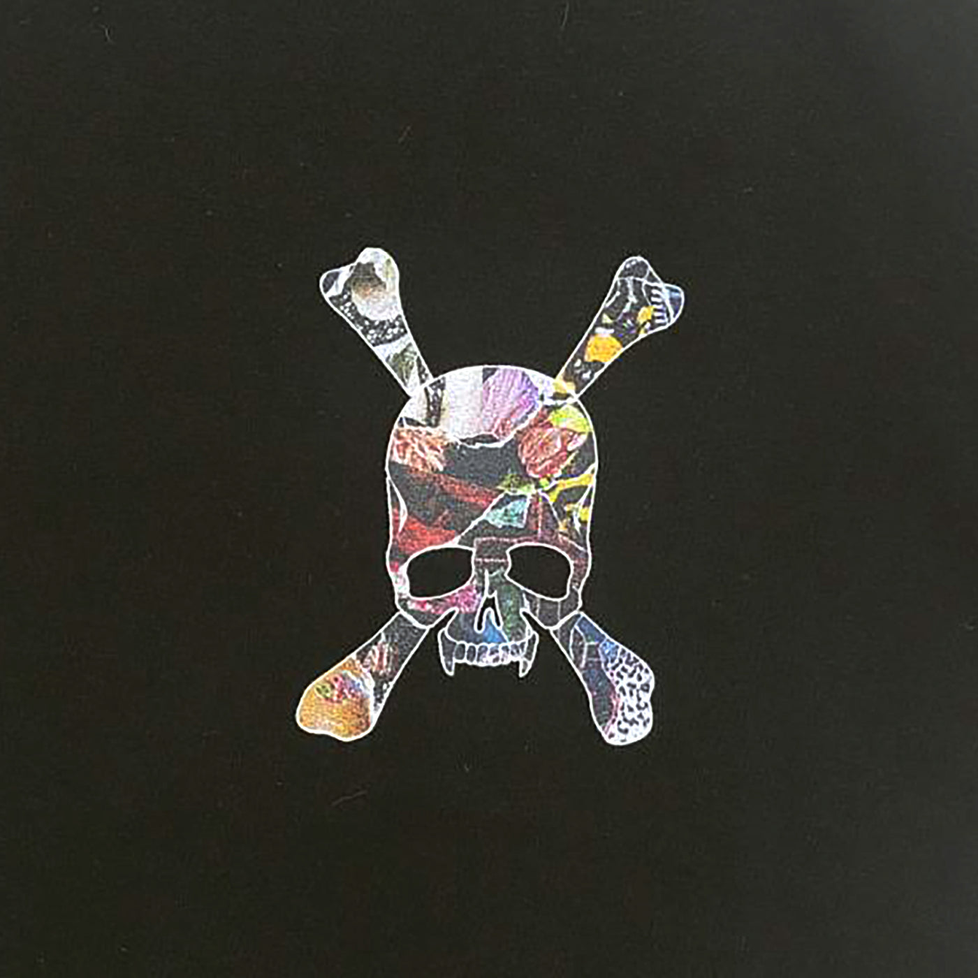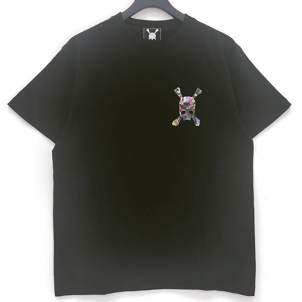 カラーリングが目を引くパッチワーク調のスカルを左胸、