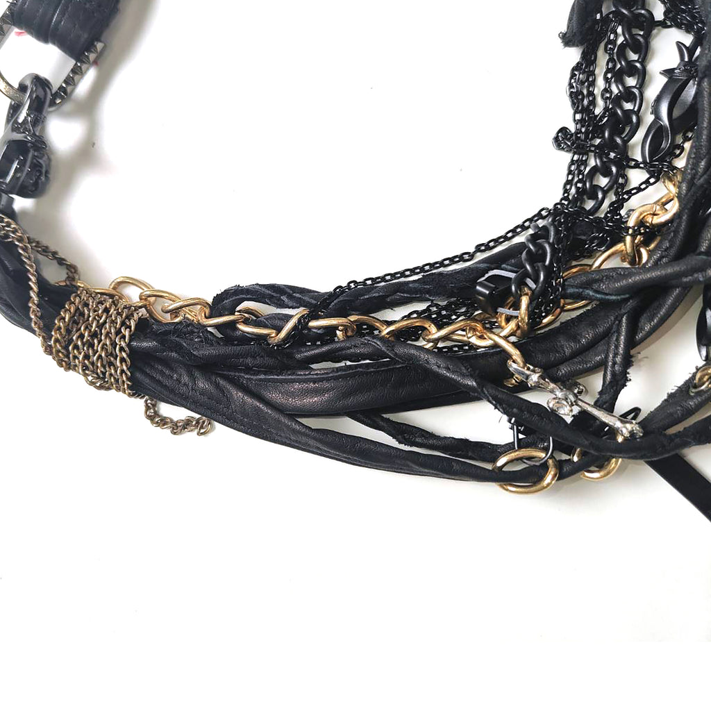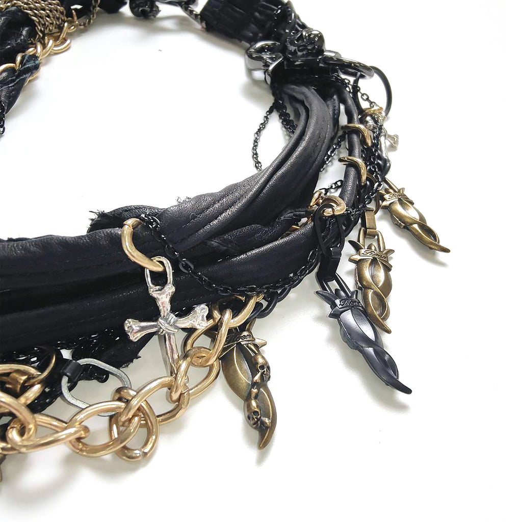 シルバー、ガンメタル、アンティークゴールド、ゴールドカラーをはじめとした様々なRoenオリジナルパーツを贅沢に使った何重にもレイヤードされた存在感のある重厚なネックレスに仕上がっております。チョーカー寄りの長さのため着用すると首元に存在感が一気に増すアイテムになっております。