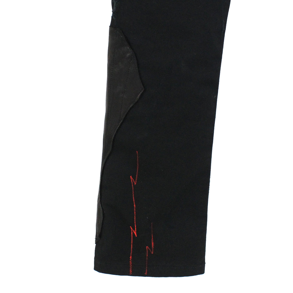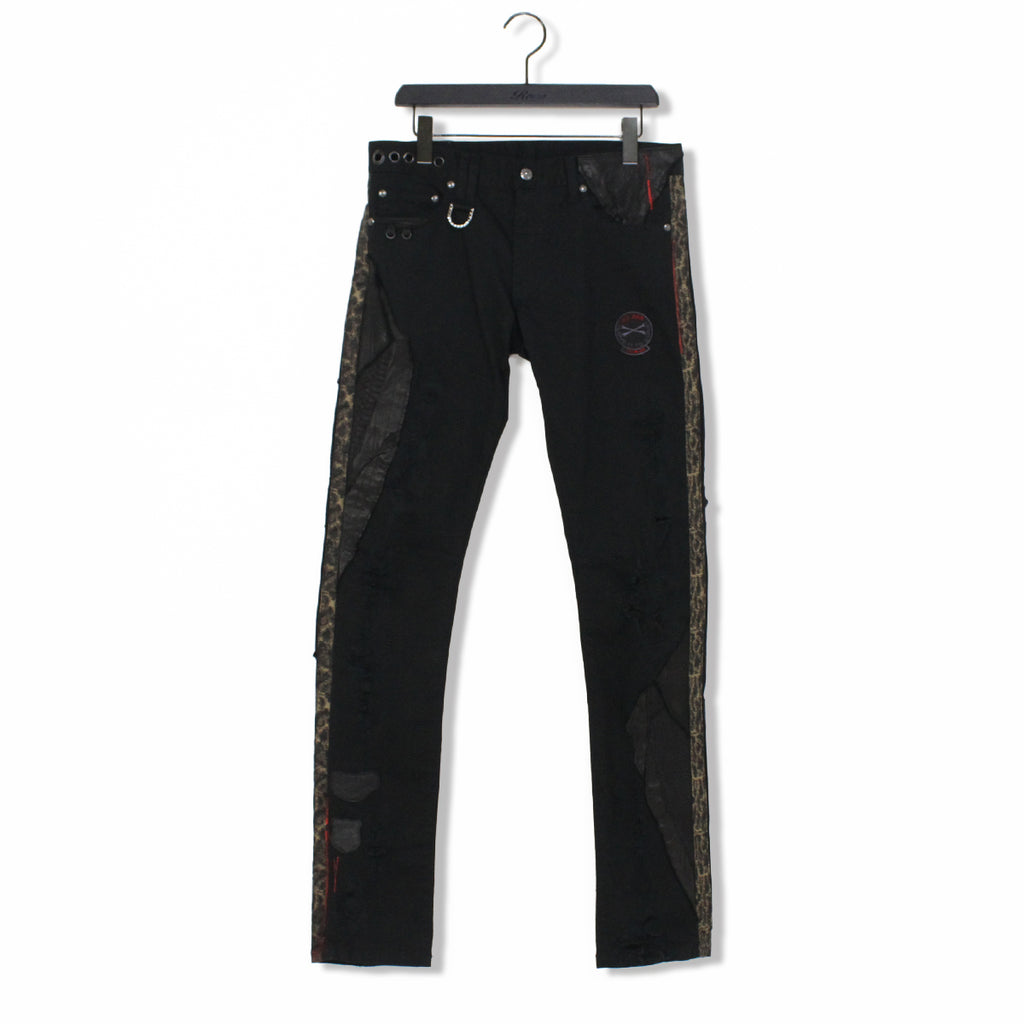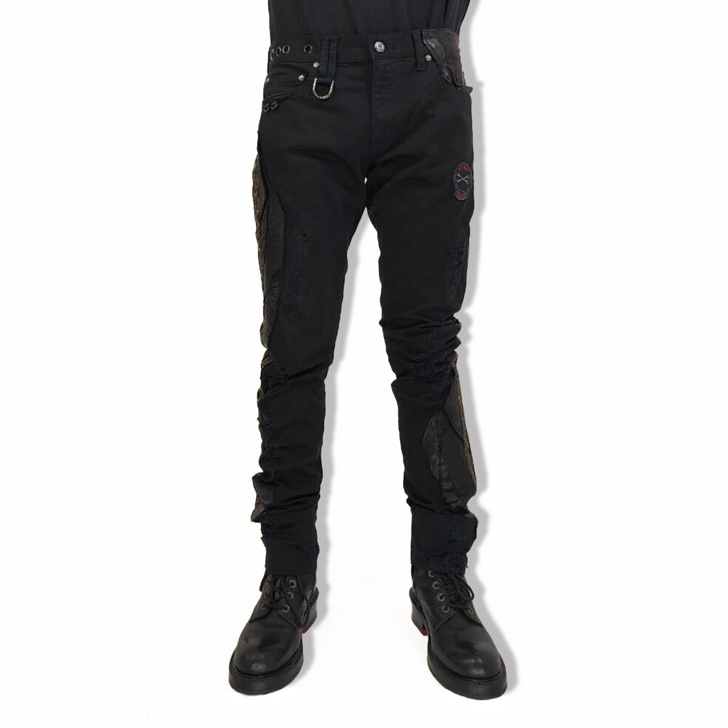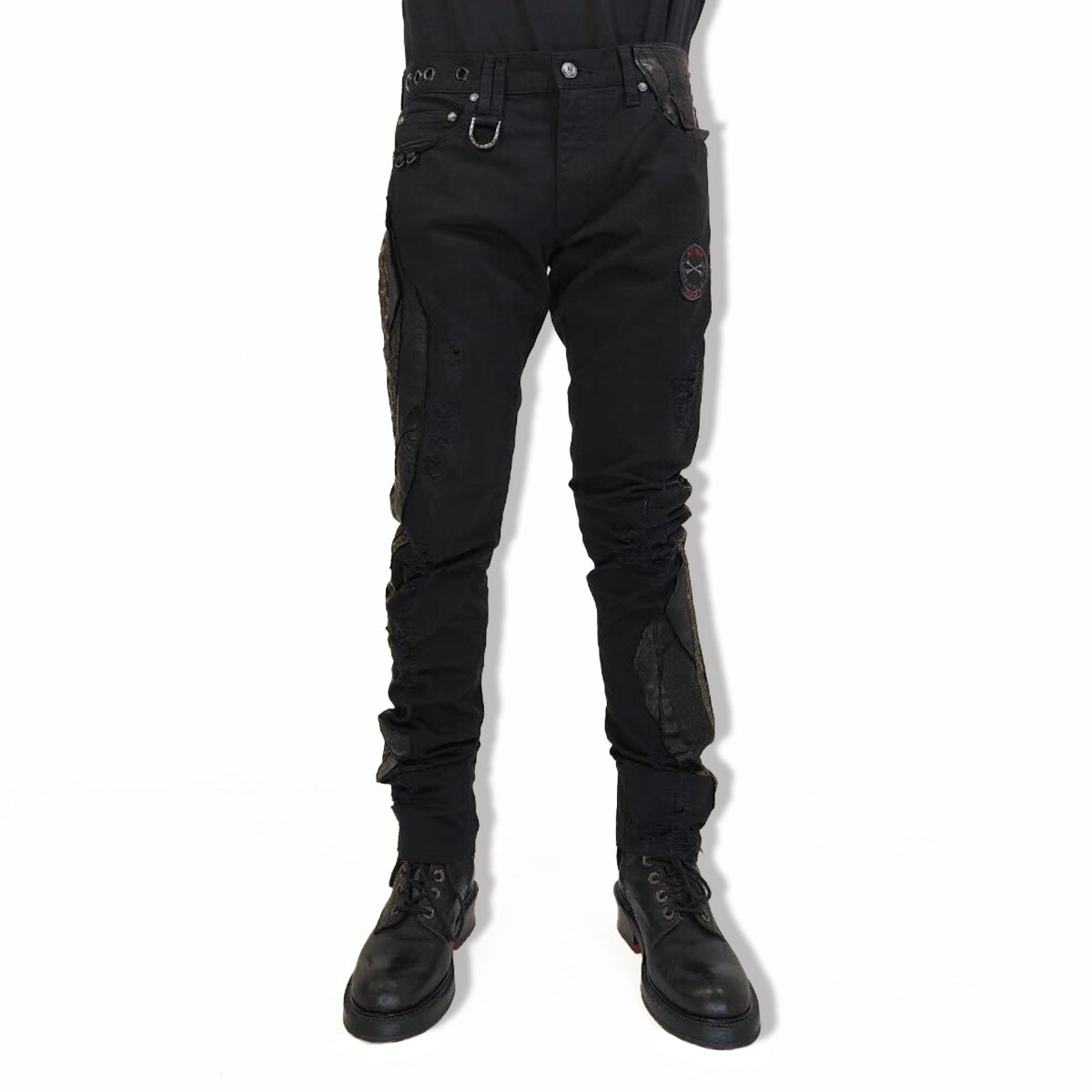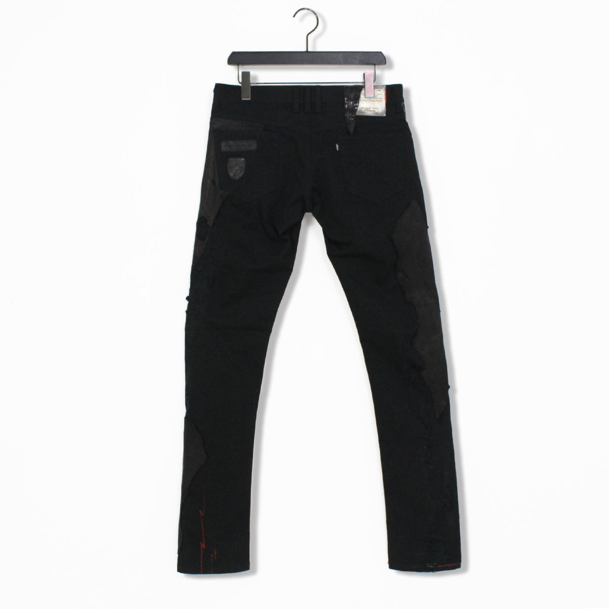 スキニーパンツ全体にカウ、スネーク等の様々なレザーを贅沢に使用しラグジュアリーも併せてワンランク上にアップデート。 また肌が密着しやすい箇所にダメージを施すことで通気性を良くし、着用の際の快適さを意識した作りになっております。 右腰付近に黒く塗ったハトメ、丸カンでのメタル素材でエッジを効かせながら、パンツの黒地に対して目が引く赤の高密度な多重縫いステッチでロックな印象の強さをプラス。 随所には敢えてラバーコーティング加工した別注ワッペンをセット、左腿付近にRoenオリジナルワッペンを一つ採用し存在感を際立たせるデザインへ昇華。 シックでハードな印象を与えながらも、主張し過ぎない同色のワッペンや赤いステッチで遊びゴコロを落とし込んだ一本に仕上がっております。 *本アイテムは一部デザイナーによるハンドメイドで商品加工/縫製を行っている一点物商品になっております。