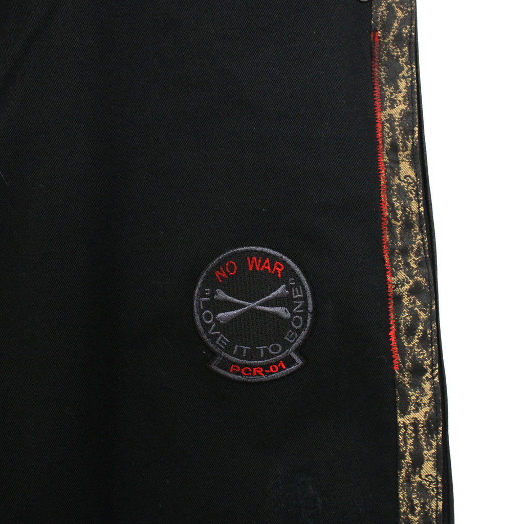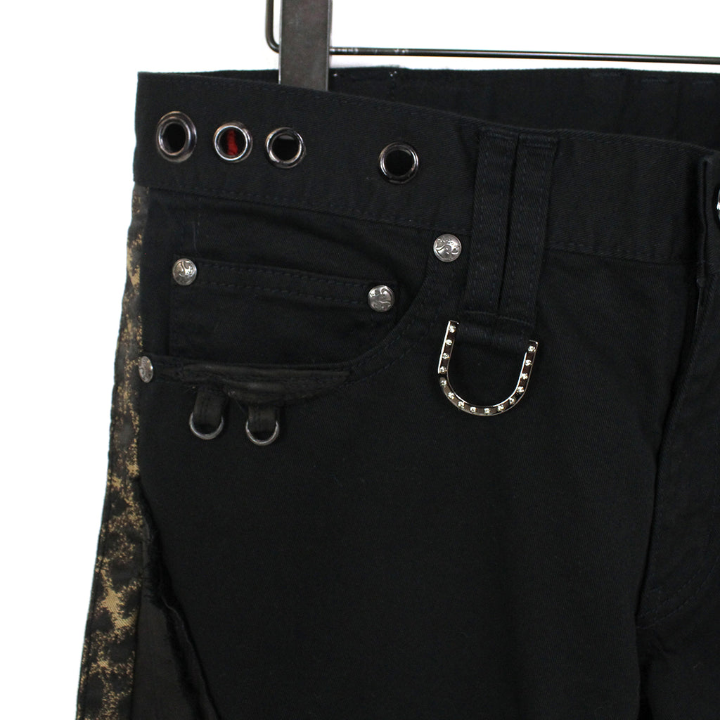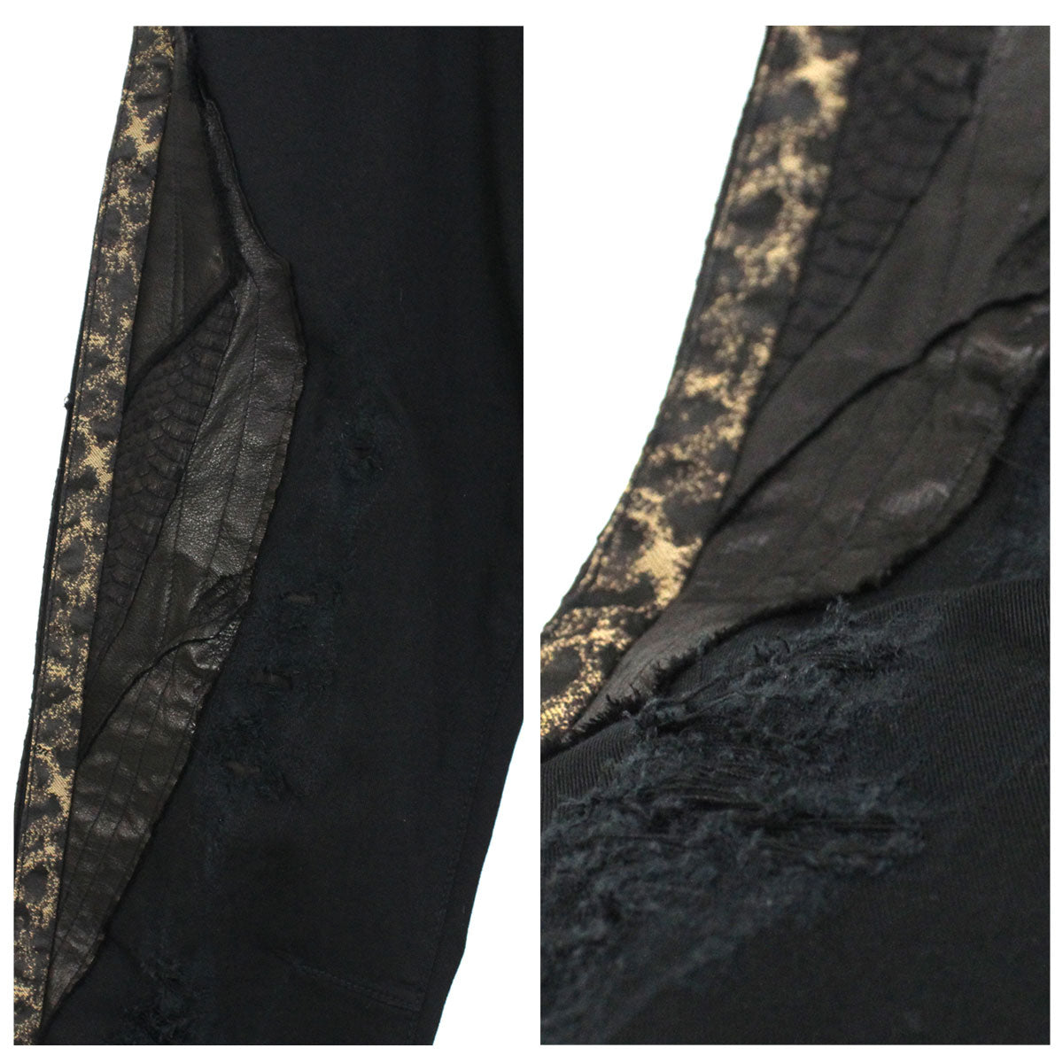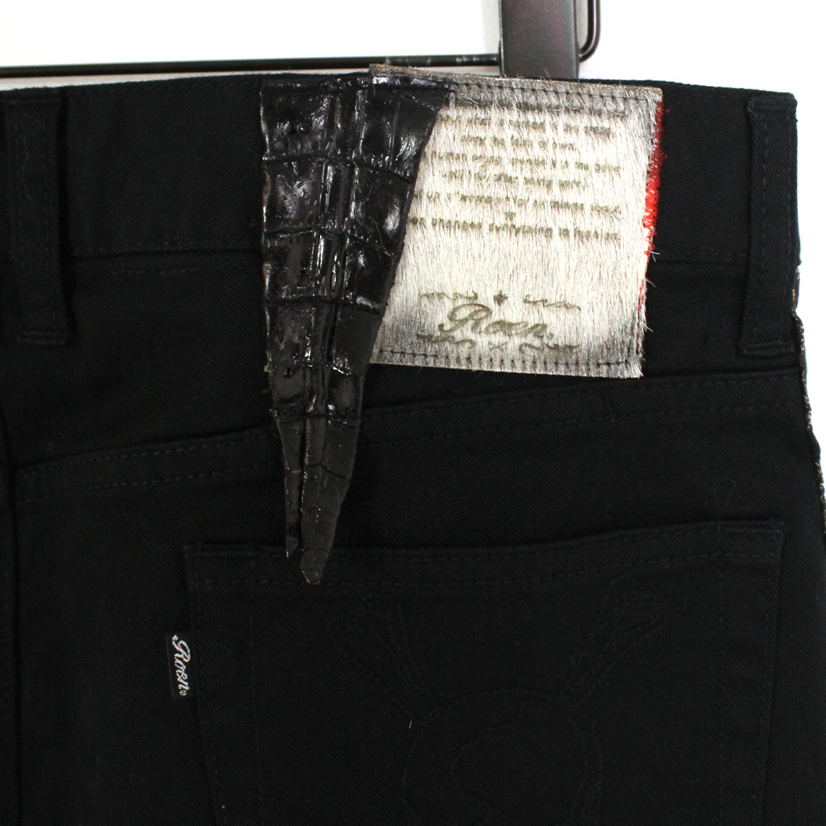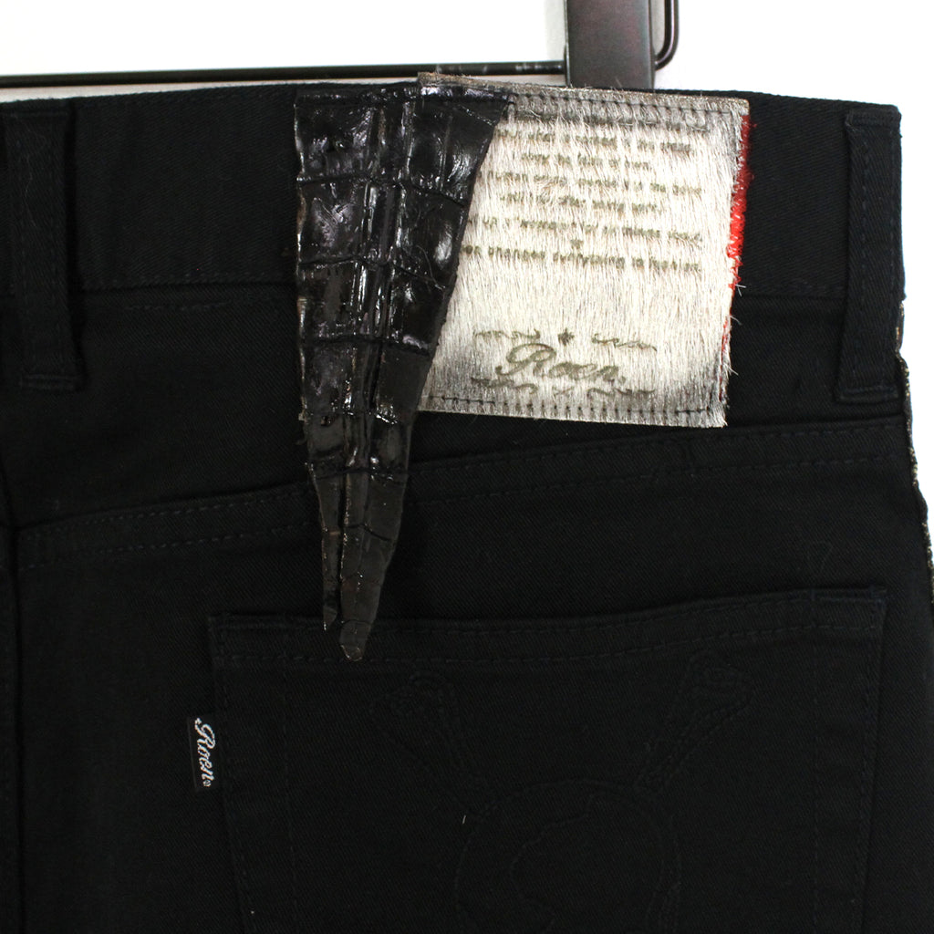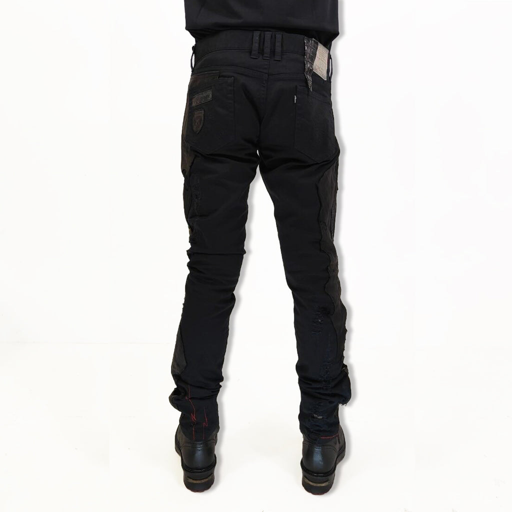 スキニーパンツ全体にカウ、スネーク等の様々なレザーを贅沢に使用しラグジュアリーも併せてワンランク上にアップデート。 また肌が密着しやすい箇所にダメージを施すことで通気性を良くし、着用の際の快適さを意識した作りになっております。 右腰付近に黒く塗ったハトメ、丸カンでのメタル素材でエッジを効かせながら、パンツの黒地に対して目が引く赤の高密度な多重縫いステッチでロックな印象の強さをプラス。 随所には敢えてラバーコーティング加工した別注ワッペンをセット、左腿付近にRoenオリジナルワッペンを一つ採用し存在感を際立たせるデザインへ昇華。 シックでハードな印象を与えながらも、主張し過ぎない同色のワッペンや赤いステッチで遊びゴコロを落とし込んだ一本に仕上がっております。 *本アイテムは一部デザイナーによるハンドメイドで商品加工/縫製を行っている一点物商品になっております。