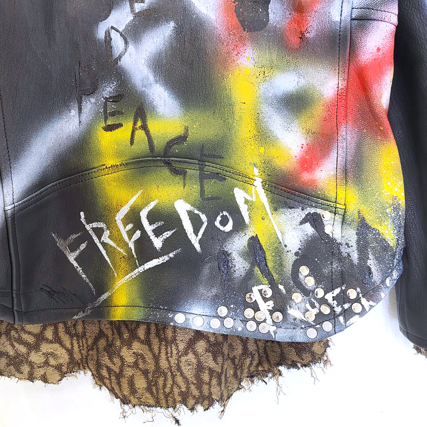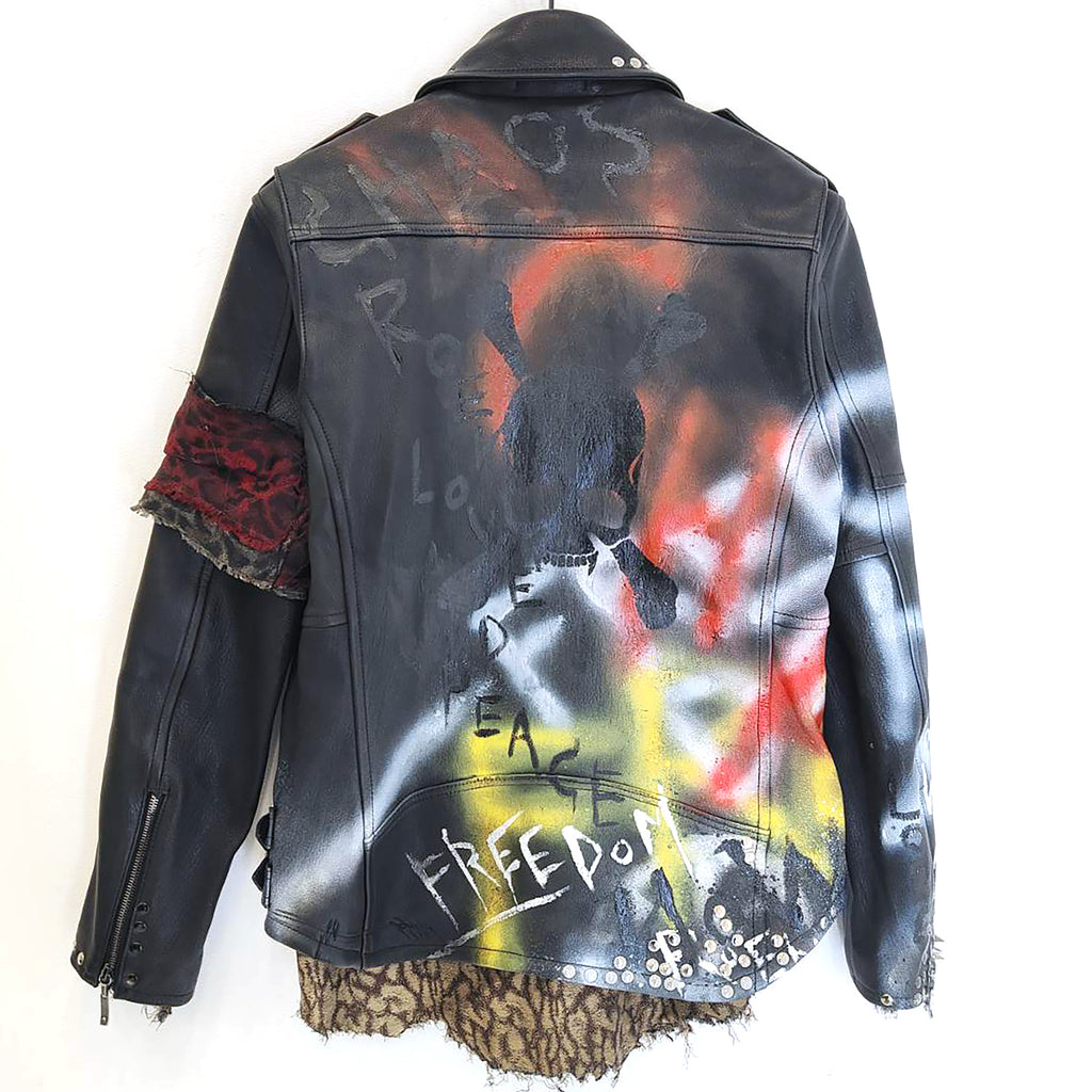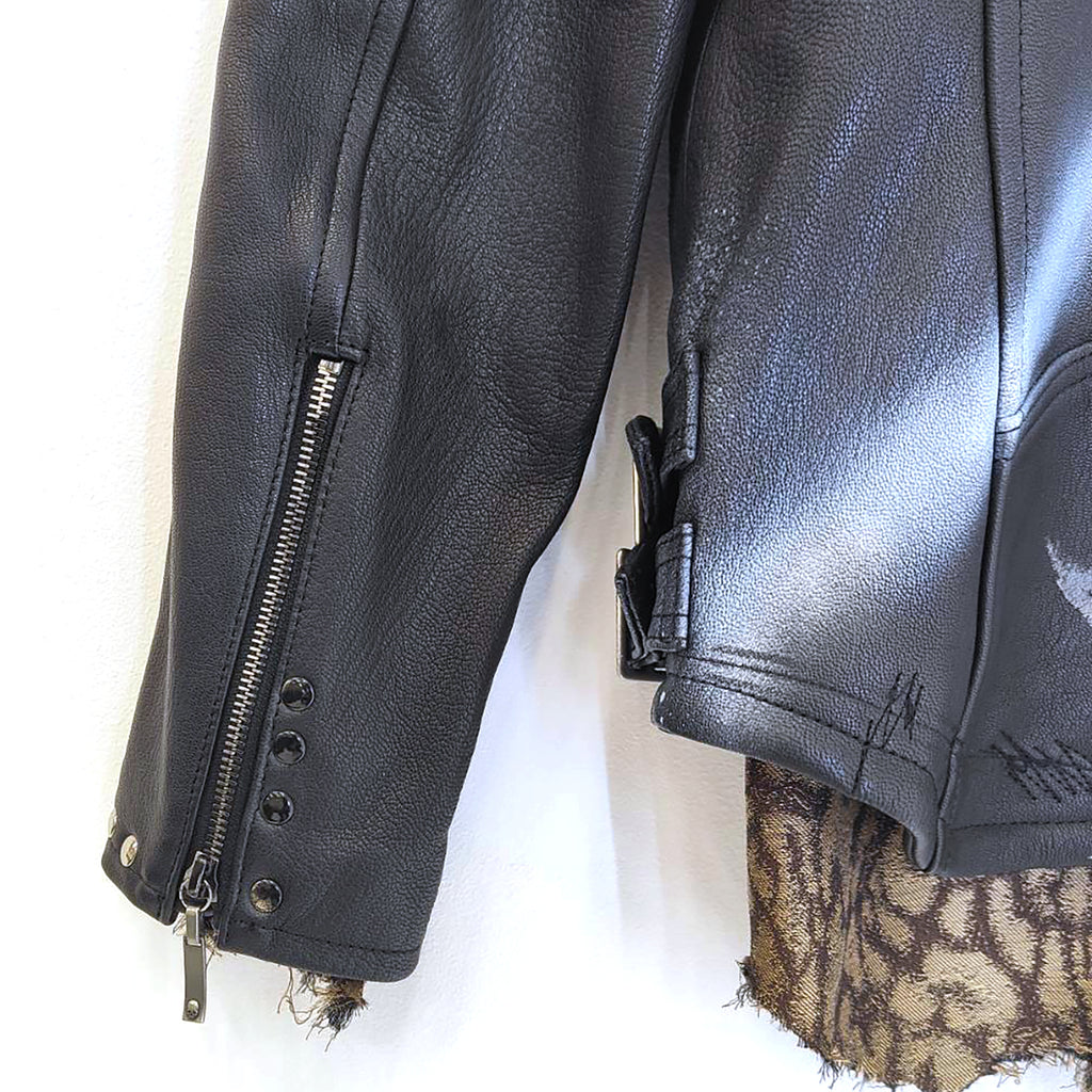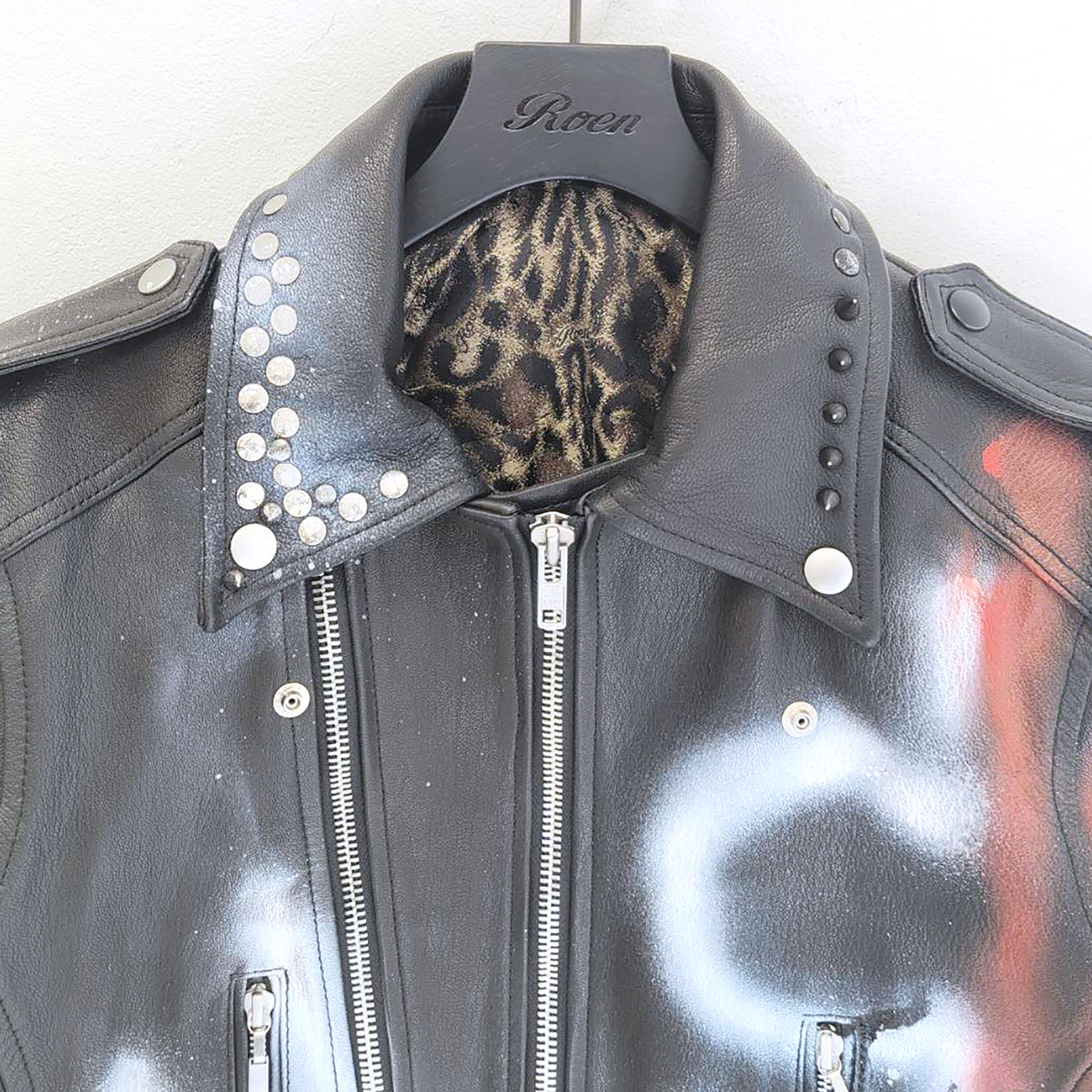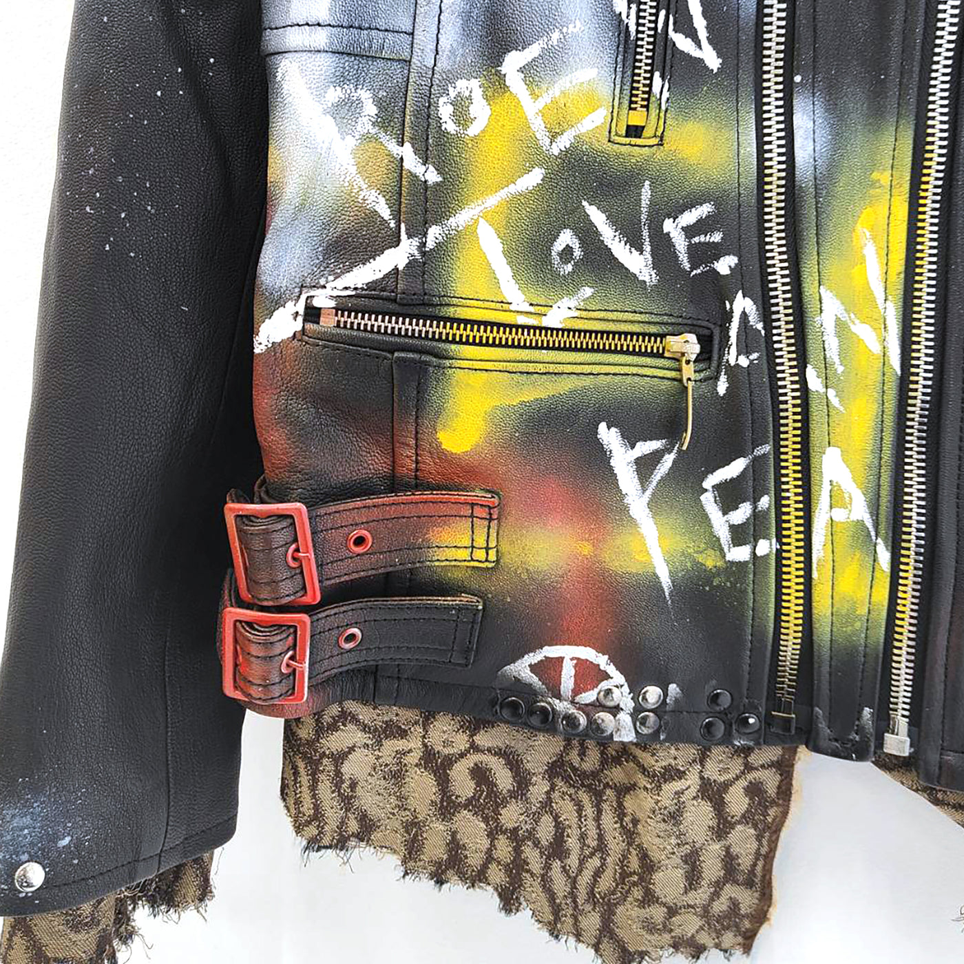 メッセージを手書きペイント。襟元、裾、にバランス良くスタッズを打ち、オリジナルDカンを左裾、オリジナル引手を数か所にさりげなくセット。