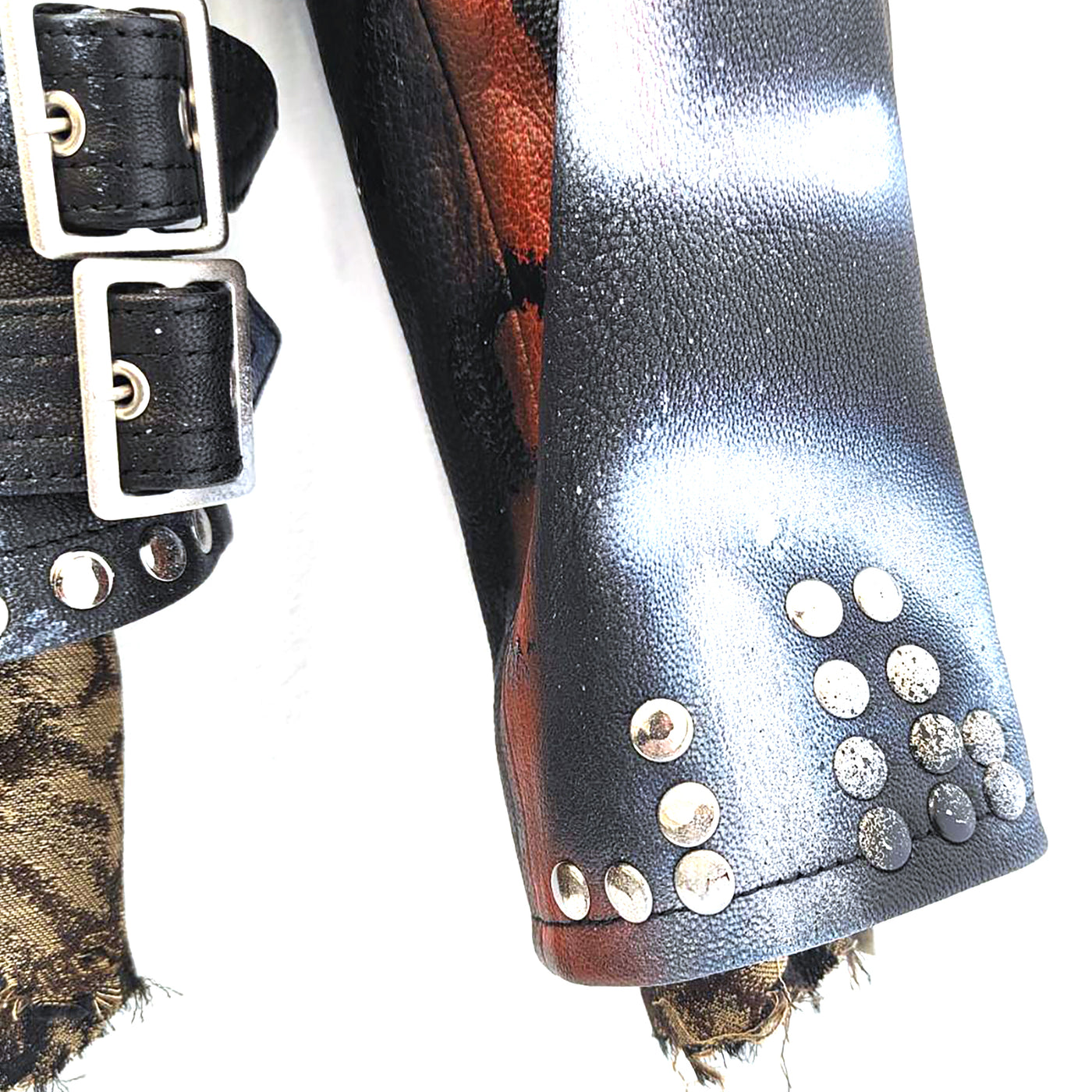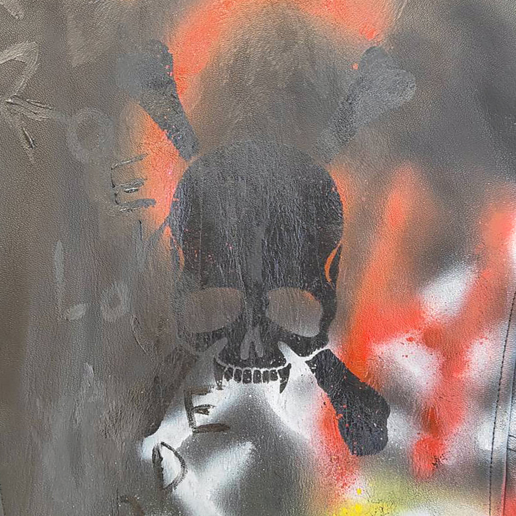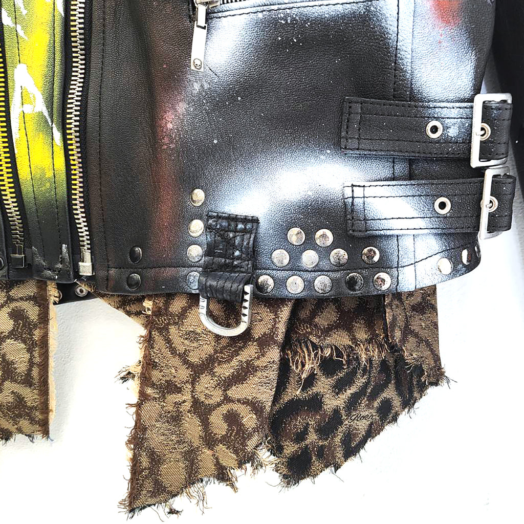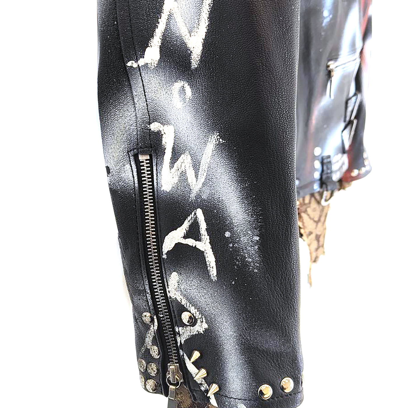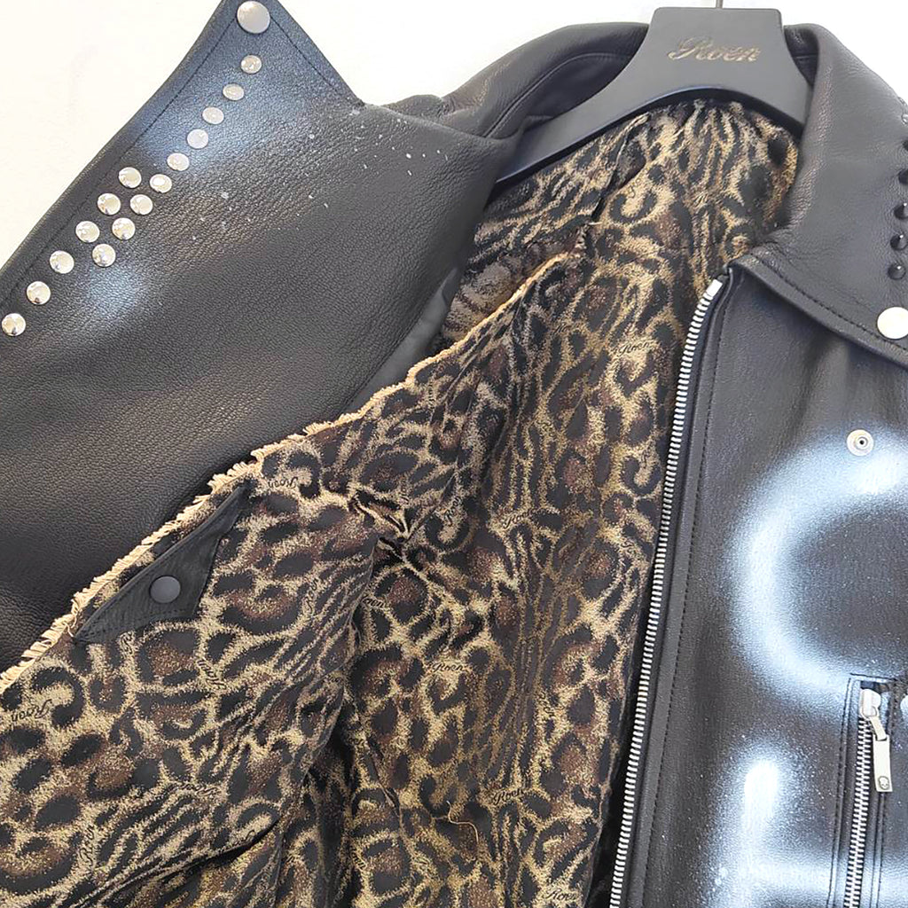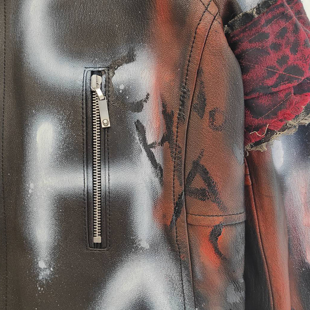 メッセージを手書きペイント。襟元、裾、にバランス良くスタッズを打ち、オリジナルDカンを左裾、オリジナル引手を数か所にさりげなくセット。