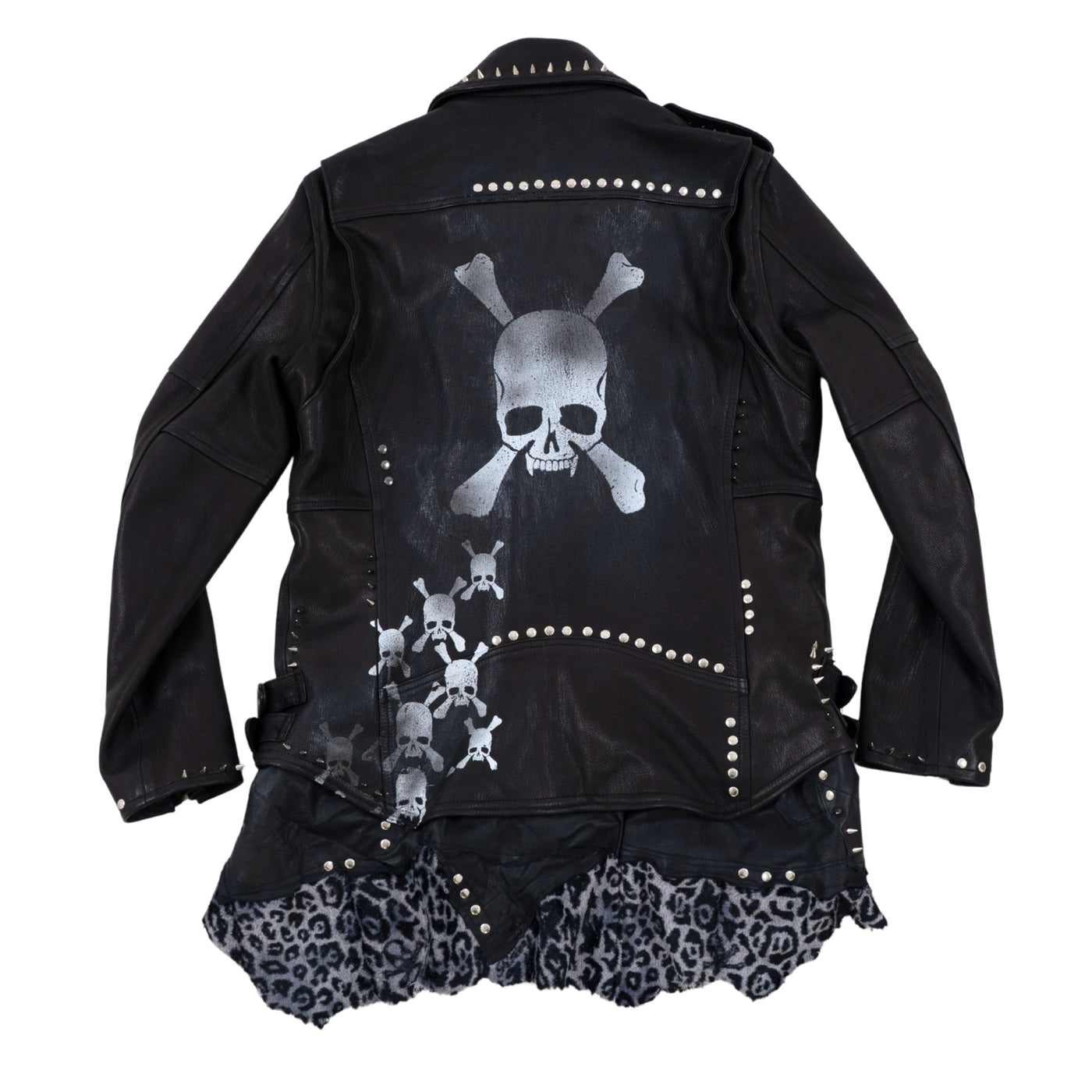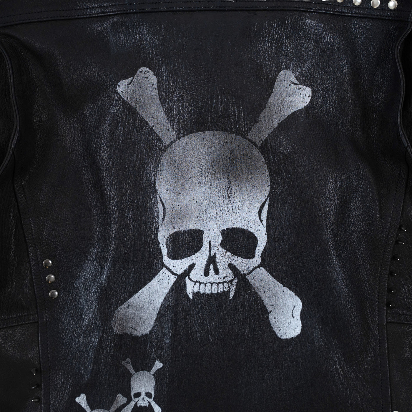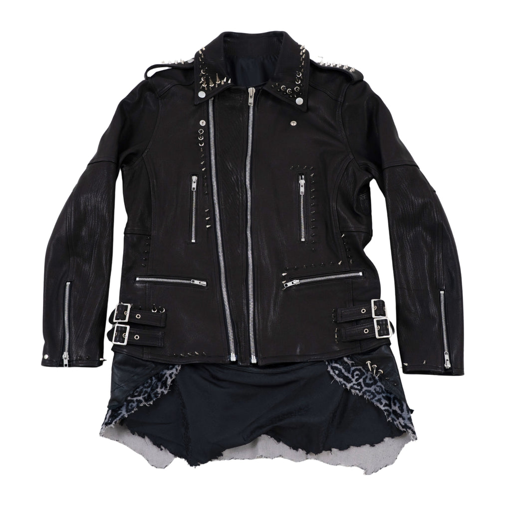 ゴートダブルライダースをベースに大小異なるスタッズを襟元、両肩、前身頃、袖先、裾にバランス良く打ち背面には白いスカルプリントをし、さらに上から吹き付けや汚し加工を施し、派手すぎない印象へアップデート。