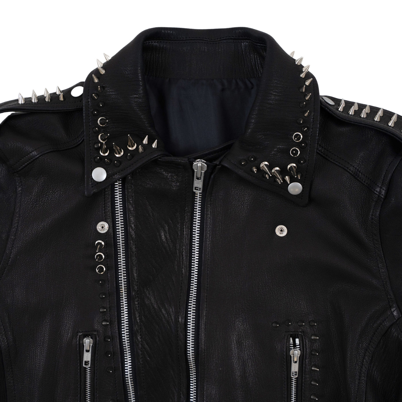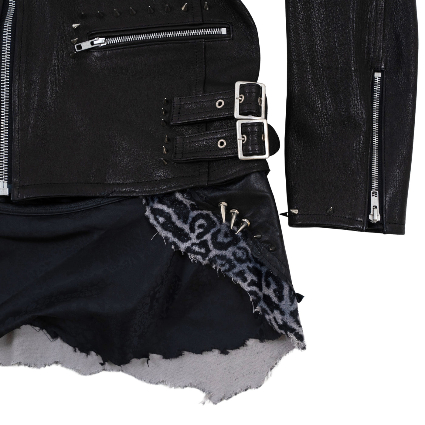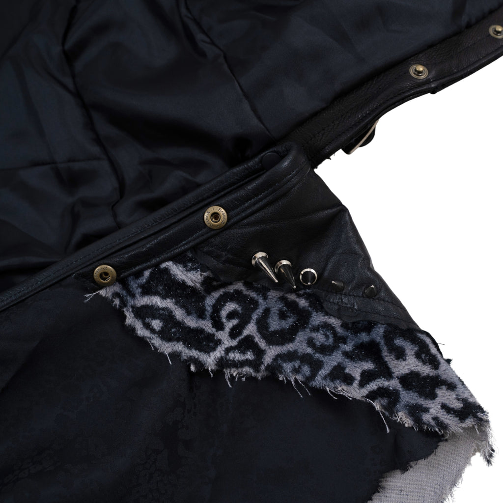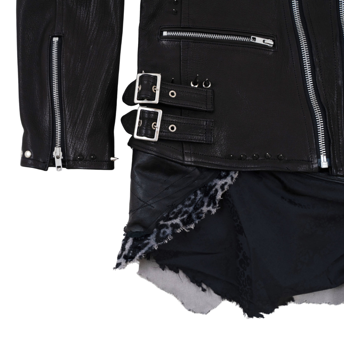 ゴートダブルライダースをベースに大小異なるスタッズを襟元、両肩、前身頃、袖先、裾にバランス良く打ち背面には白いスカルプリントをし、さらに上から吹き付けや汚し加工を施し、派手すぎない印象へアップデート。