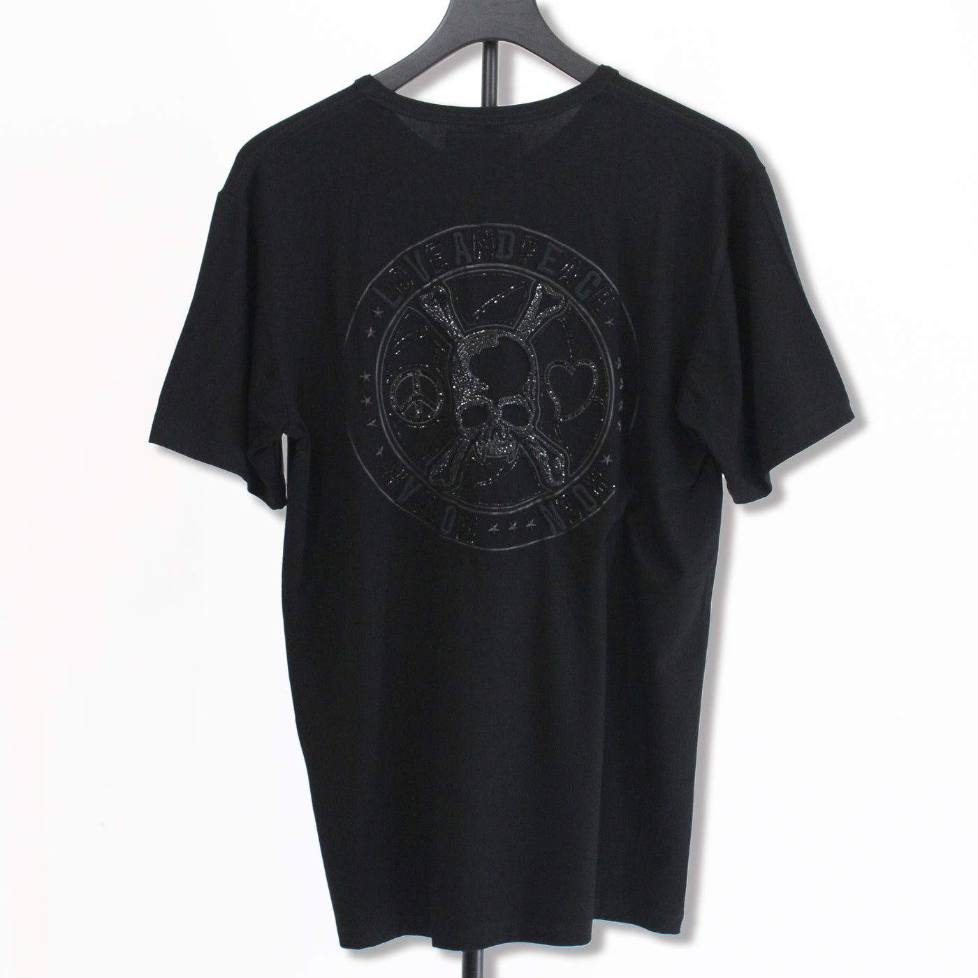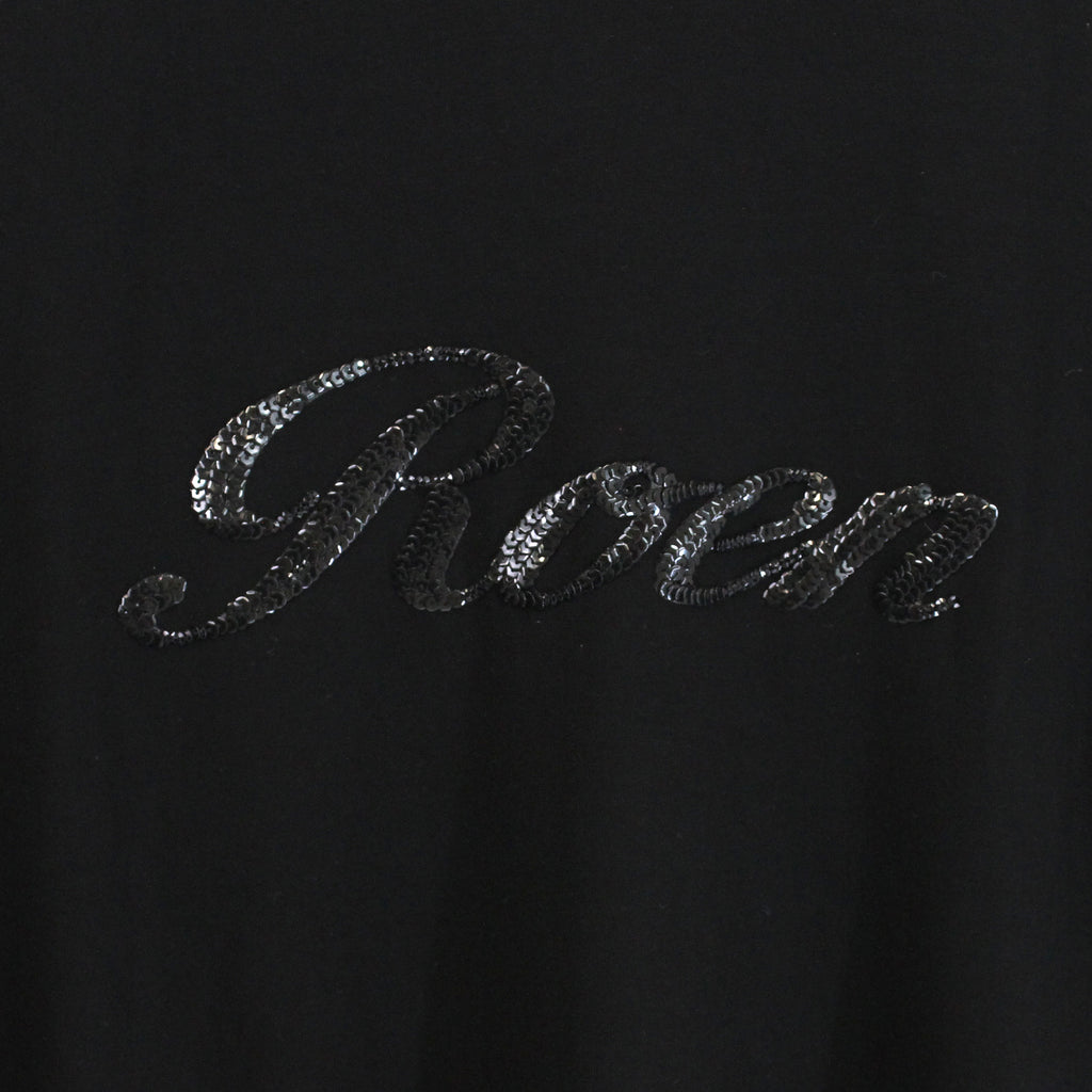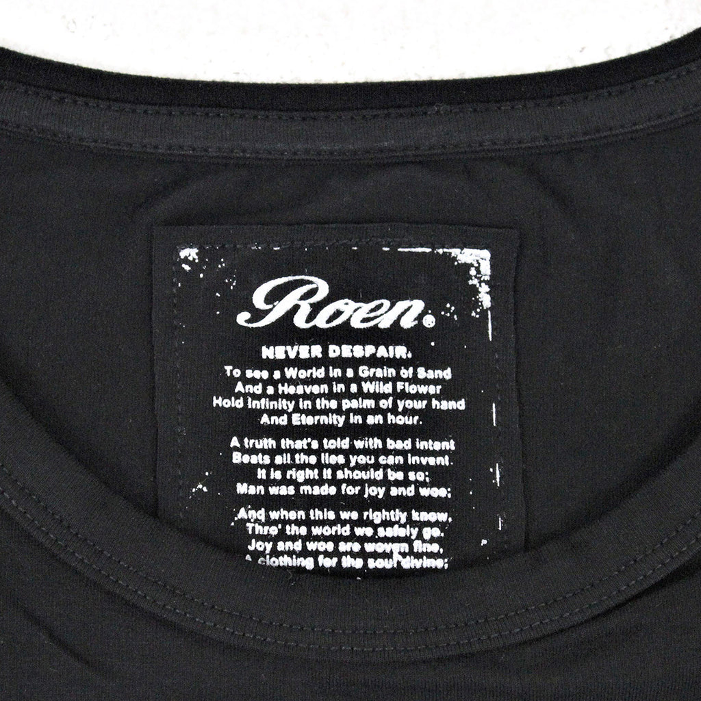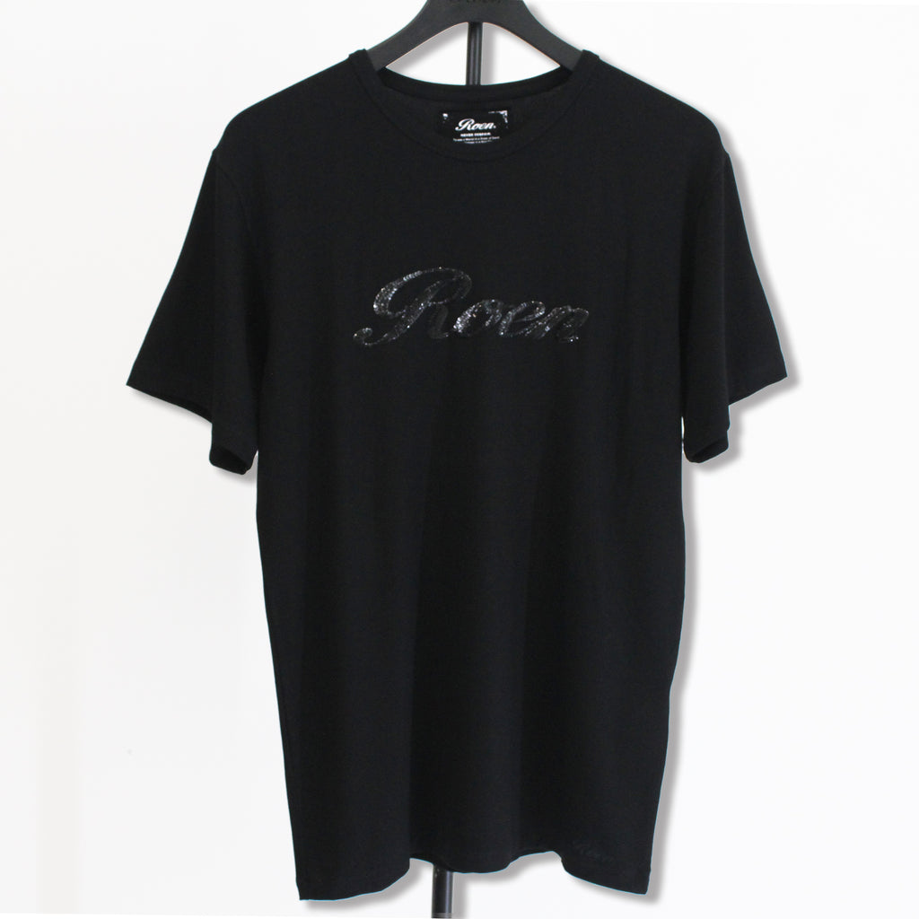 表にはRoenロゴ、バックには定番サークルスカルを熟練した職人の手で光沢のあるビーズやスパンコールによりグラフィックを1点1点、手刺繍で表現。細かいパーツや密集した個所まで緻密に仕上げ、存在感のある1枚になっている。 ボディはストレッチ性に優れながら、コシのあるしっかりしたある生地になっているため着用の際ストレスを感じさせない。左裾にはRoenロゴ刺繍入り。